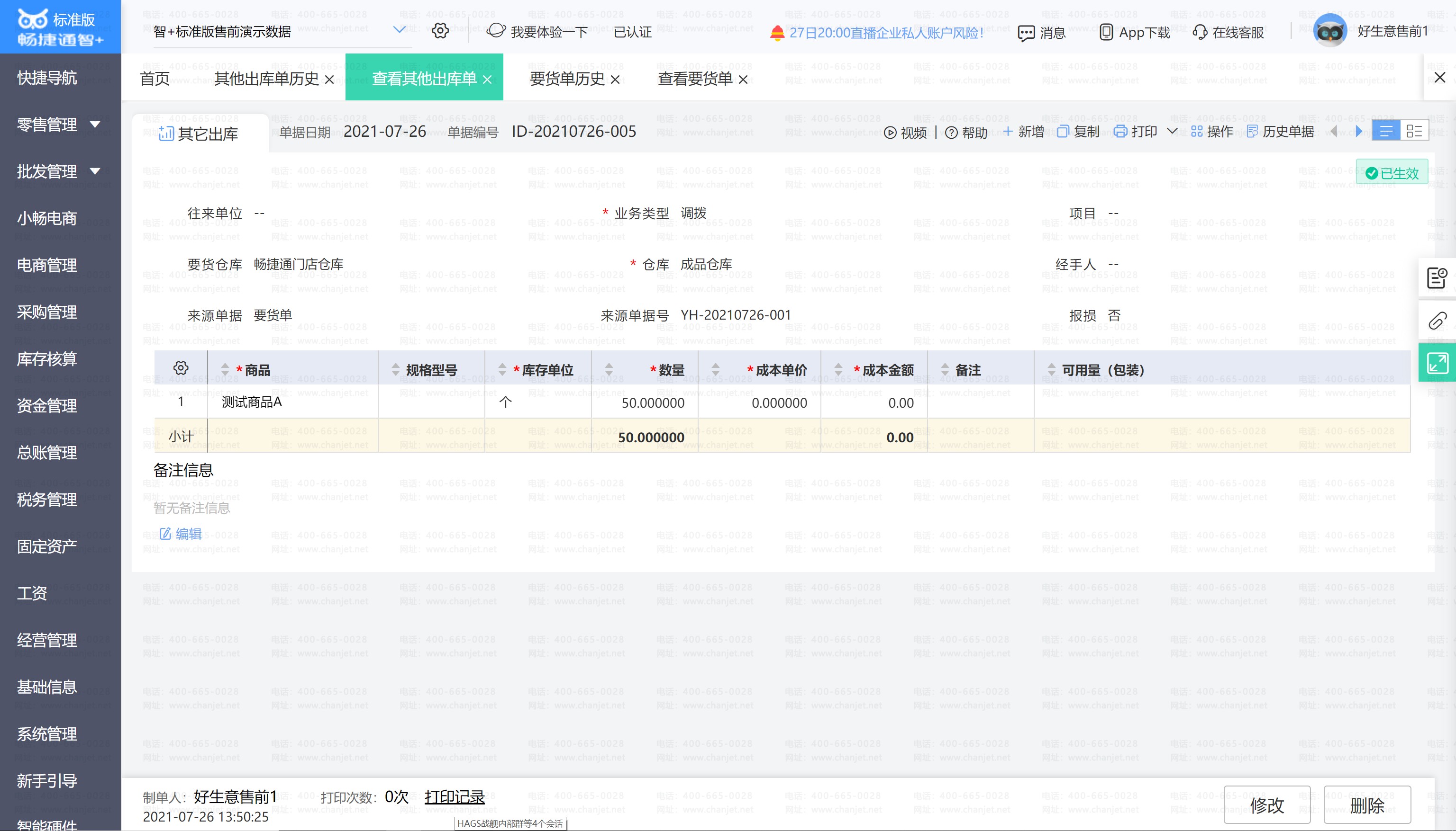 (2)总部看到要货单后,进行供应链后台处理,形成出库业务