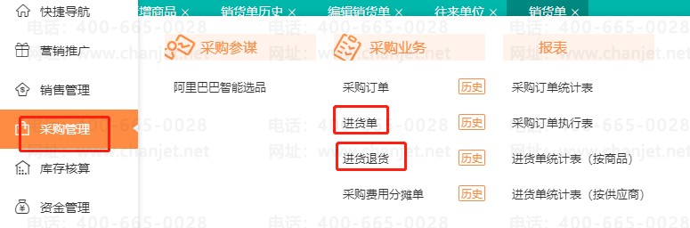 7月5日,发生采购退货,进入【采购管理】-【进货退货单】