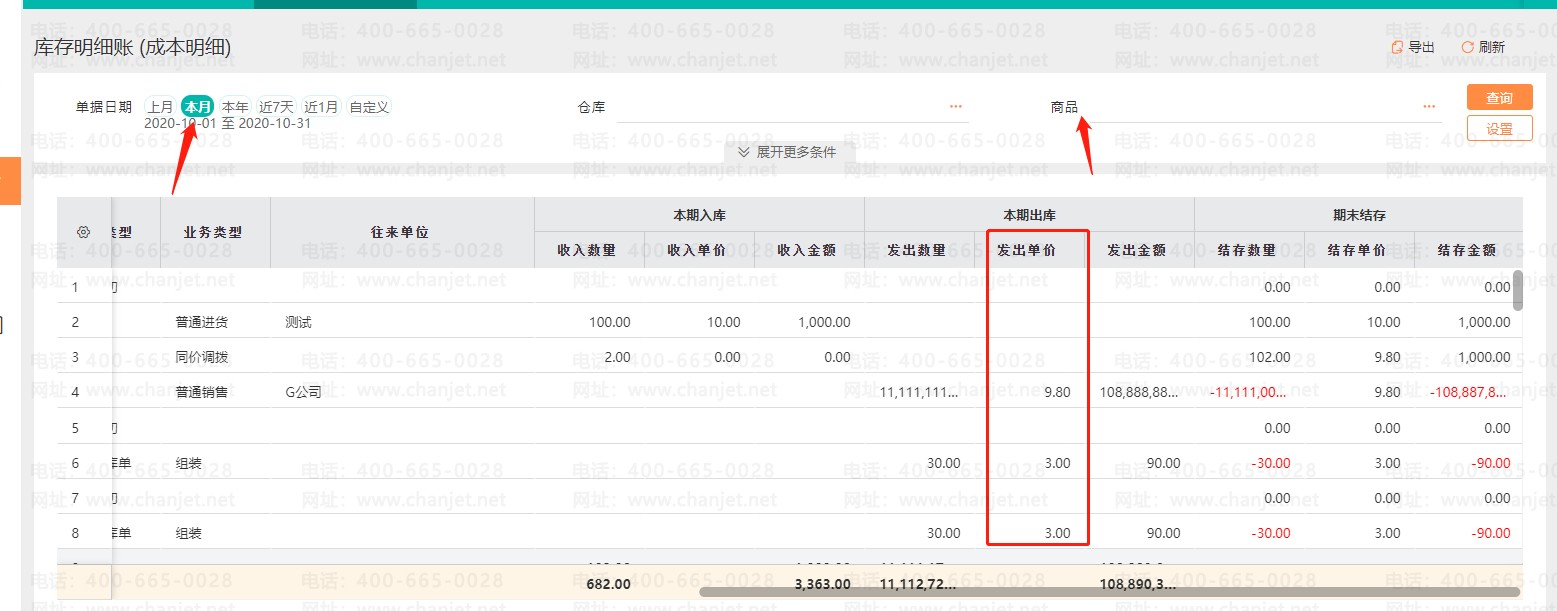 点击【库存核算】-【库存成本明细账】界面,查看一下这个商品的发出单价,看下哪一次的销售的发出单价有问题,勾选出来【成本取值类型】。