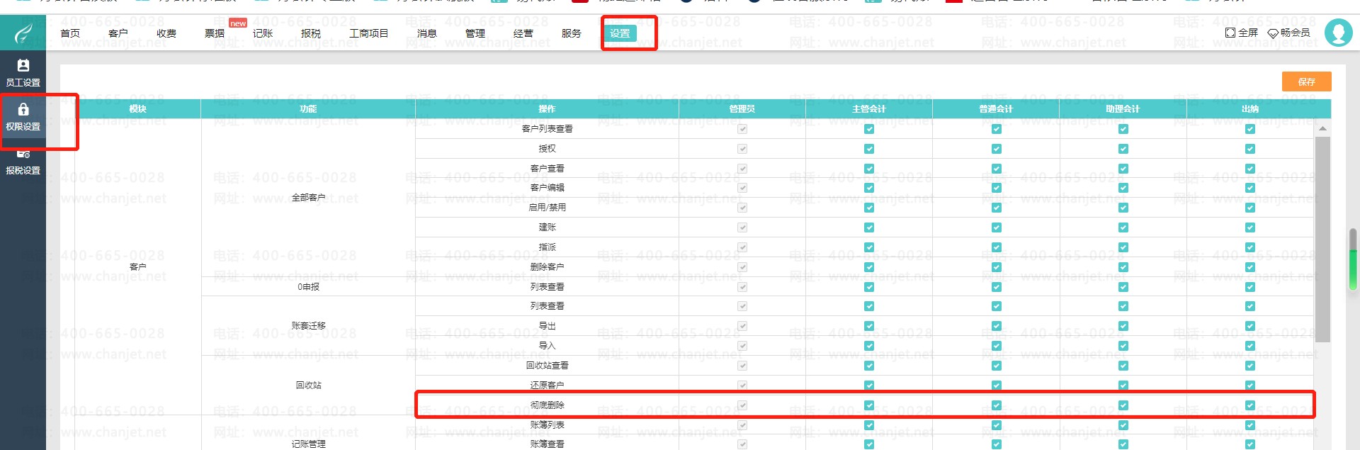 登录管理员账号,进入易代账工作台,点击【设置】,选择左侧权限设置按钮,对应角色勾选上彻底删除权限。