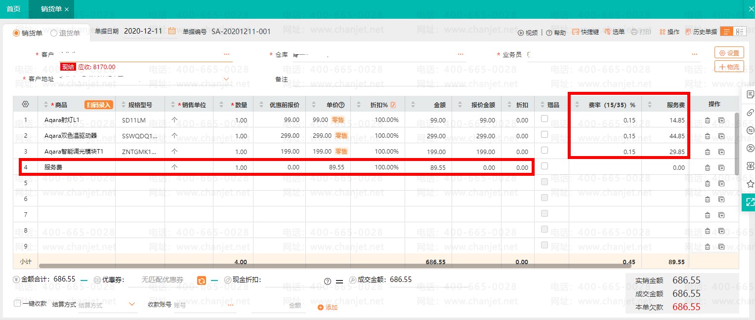*通过好生意单据自定义项,设置服务费公式,销售开单输入相应服务费费率,自动核算本单服务费,免去了人工反复计算的时间,同时好生意支持销货单分享,能直接把销货单分享给客户,让客户对产品费安装费一目了然。