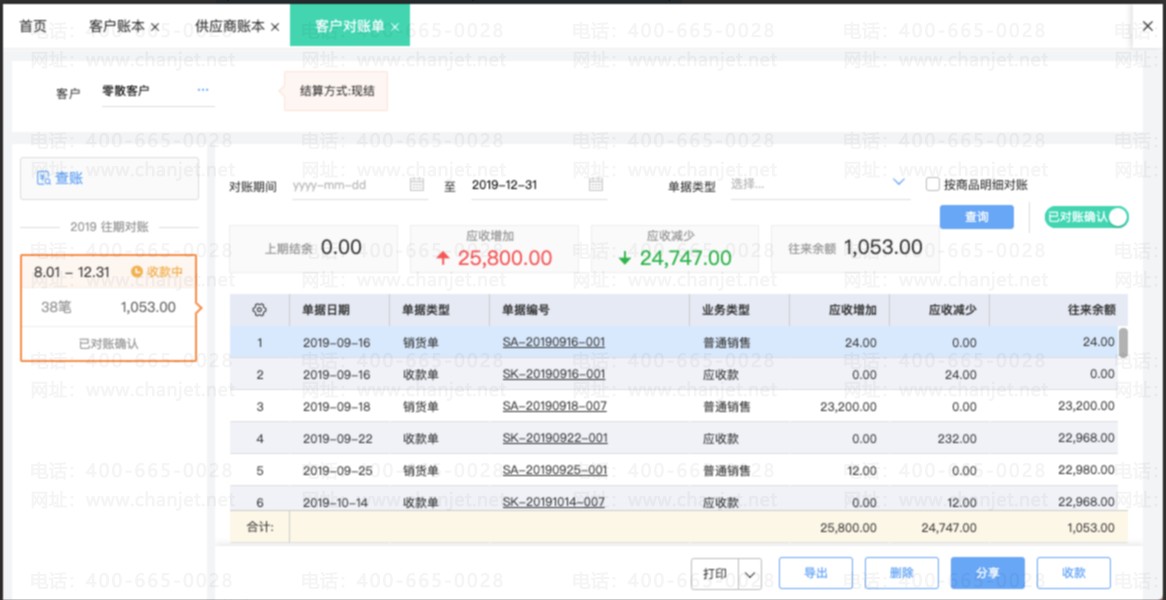 已收款:当前对账内的单据都核销完毕后,此对账单状态变为已收款。