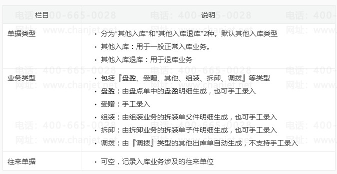 其他入库单用来处理除采购入库、产成品入库之外的其他入库业务,因此其他入库单可处理多种类型的入库业务,比如:受赠入库、盘盈入库、组装拆卸入库等业务形成的入库单