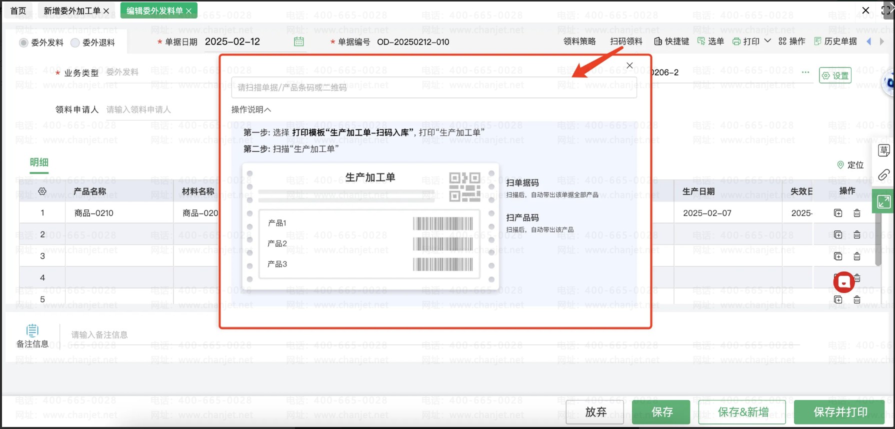 • 当扫描『加工单产品行码』时,系统会将对应产品所需的未出库的材料,带入到委外发料单中。