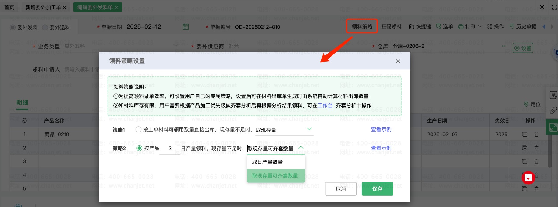 为提⾼领料录单效率,系统可根据『领料策略』⾃动计算材料出库数量,方便用户快速生成发料出库单