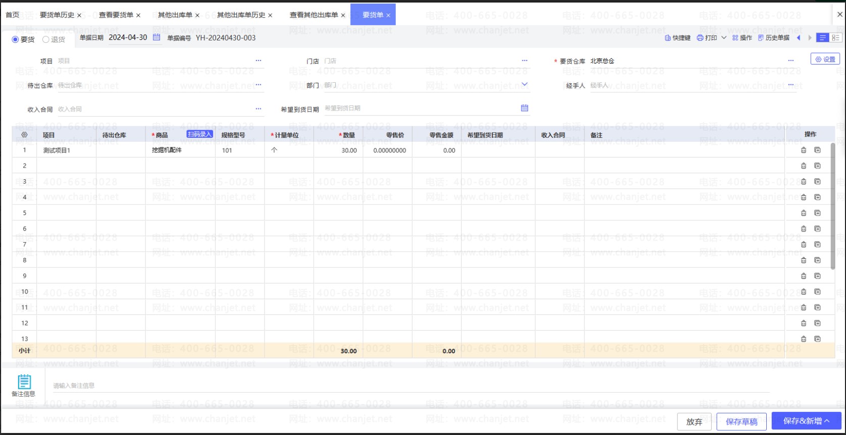 选择方向(要货/退货),维护单据表头表体后进行保存新增,审核后可进行生单处理。