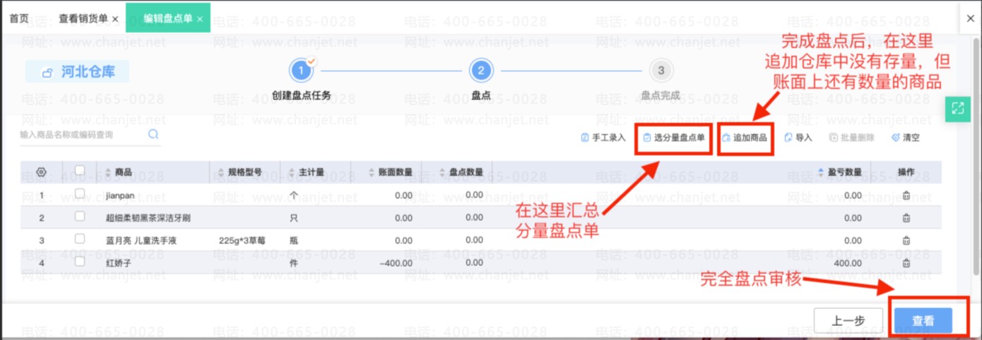 ① 通常使用“实物盘点”时,需要将在仓库中没有清点到的商品,但在账面上还有结存的商品追加到盘点单中