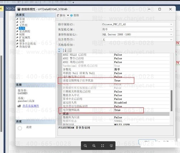 在客户账套数据库,打开数据库管理软件Microsoft SQL Server Management Studio,右键客户账套数据库,选择“属性”,在打开的界面中选择“选项”,把“读提交快照处于打开状态”和“允许快照隔离”都设置为True,如截图中所示的两个选项,修改之后保存,重新登录T+正常使用即可。