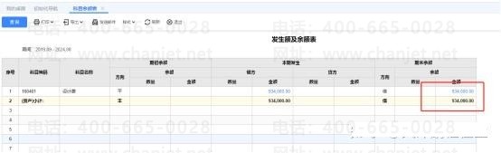 3、然后查询科目余额表160401科目2019年度到2024年度就是934000,这个金额是160401科目20和21两个年度本期发生额474000加上160403科目20年度的460000得来的