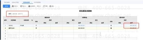 2、登录软件查询余额表的160401科目2019到2020年度12月份是没有余额的,160403科目有460000