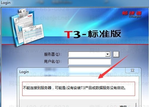 T3软件登录提示不能连接到服务器 ,可能是:没有安装T3产品或数据服务没有启动。