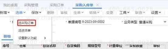 2、当供应商送货过来,打开采购入库单选单-选采购订单,选择相应有采购订单,并确定,如图下操作: