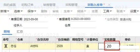 3、生成的采购入库单默认带来的数量就是采购订单上面的数量,但是实际供应商多送了20,把100改120并保存,却出现如图下提示:行1【A材料】数量上限为100.00盒,超过订单数量20.00盒不允许此操作!。