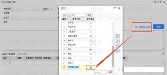 6、补充:如果超入库的20个想要单独做一张入库单,别于区分超了多少又要关联采购订单,那默认入完的采购订单肯定就不会显示出来了,这时候就需要通过过滤条件设置,调出包含已执行完的采购订单,就可以继续关联采购订单入库了。具体操作如下,选单-选择采购订单,点“过滤条件设置”,勾上“包含已执行完”并确定,如图下: