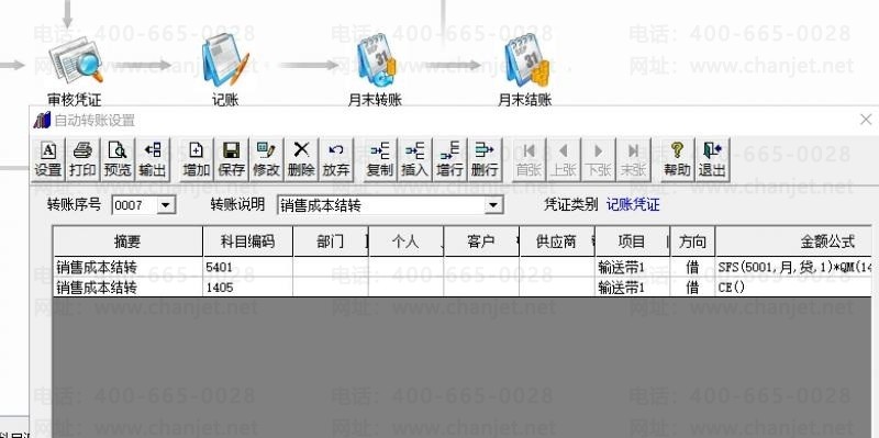 点总账→点期末→点转账定义→点自定义转账→点增加→转账序号:例如:0001→转账说明:例如:制造费用转生产成本→选择凭证类别→确定→选择科目编码:一定要设末级明细→例如:生产成本的末级明细→方向→借→金额公式→双击→点开放大镜→点取对方科目计算结果→点下一步→点完成→点增行→科目编码:例如:制造费用的末级明细→方向→贷→金额公式→双击→放大镜点开→借方发生额→点下一步→点完成→依次设置制造费用所的末级明细→保存→退出
