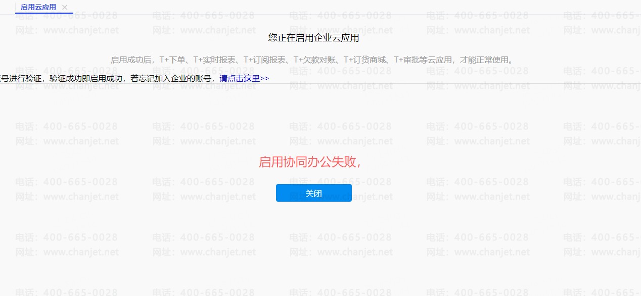 用友T+专属云新增用户无法登录,提示不在云应用企业中,查看云应用发现是未启用状态,点击启用,选择企业管理员登录,又提示启用协同办公失败