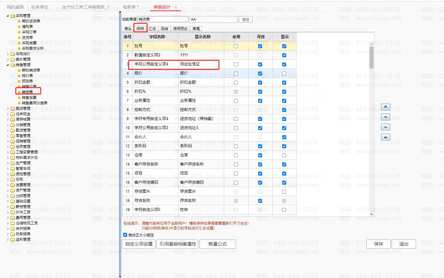 这边测试栏目设置是可以显示销货单单据的自定义字段的,