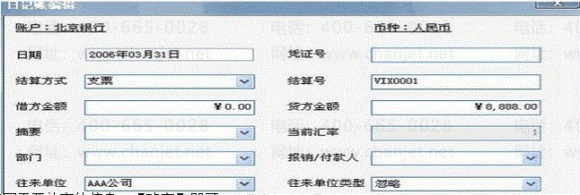 填写完毕,如果之前在管理票据账户中设定了关联日记账账户,那么在此选择【确定】,会弹出以下日记账登记窗口,可将相应内容自动添加到银行日记账中。