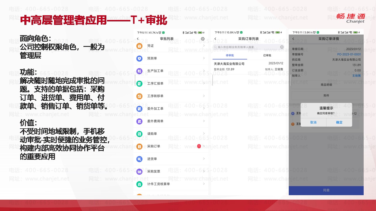 解决随时随地完成审批的问题。支持的单据包括:采购订单、进货单、费用单、付款单、销售订单、销货单等。