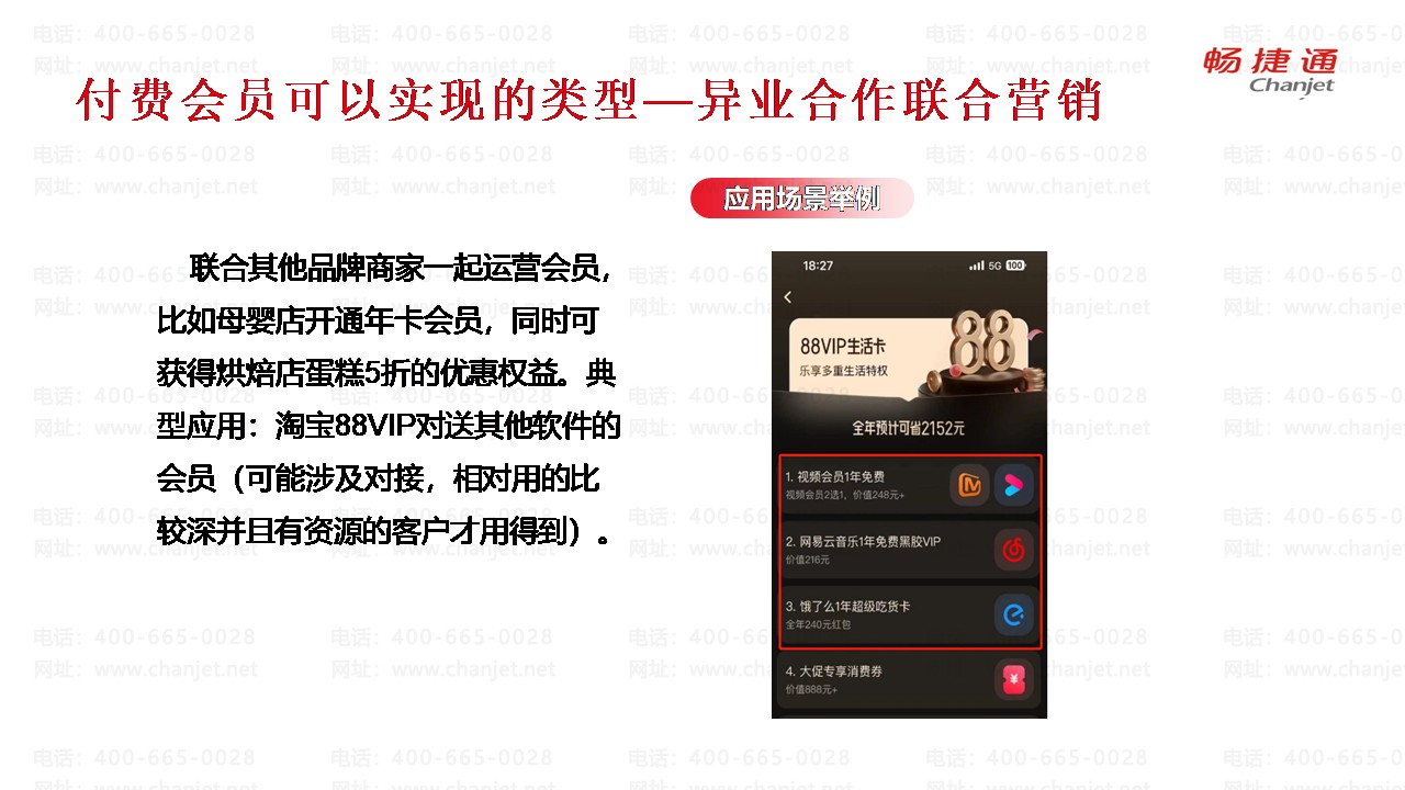 联合其他品牌商家一起运营会员,比如母婴店开通年卡会员,同时可获得烘焙店蛋糕5折的优惠权益。典型应用:淘宝88VIP对送其他软件的会员(可能涉及对接,相对用的比较深并且有资源的客户才用得到)。