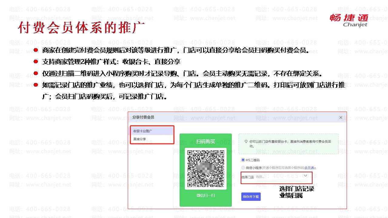 商家在创建完付费会员规则后对该等级进行推广,门店可以直接分享给会员扫码购买付费会员。