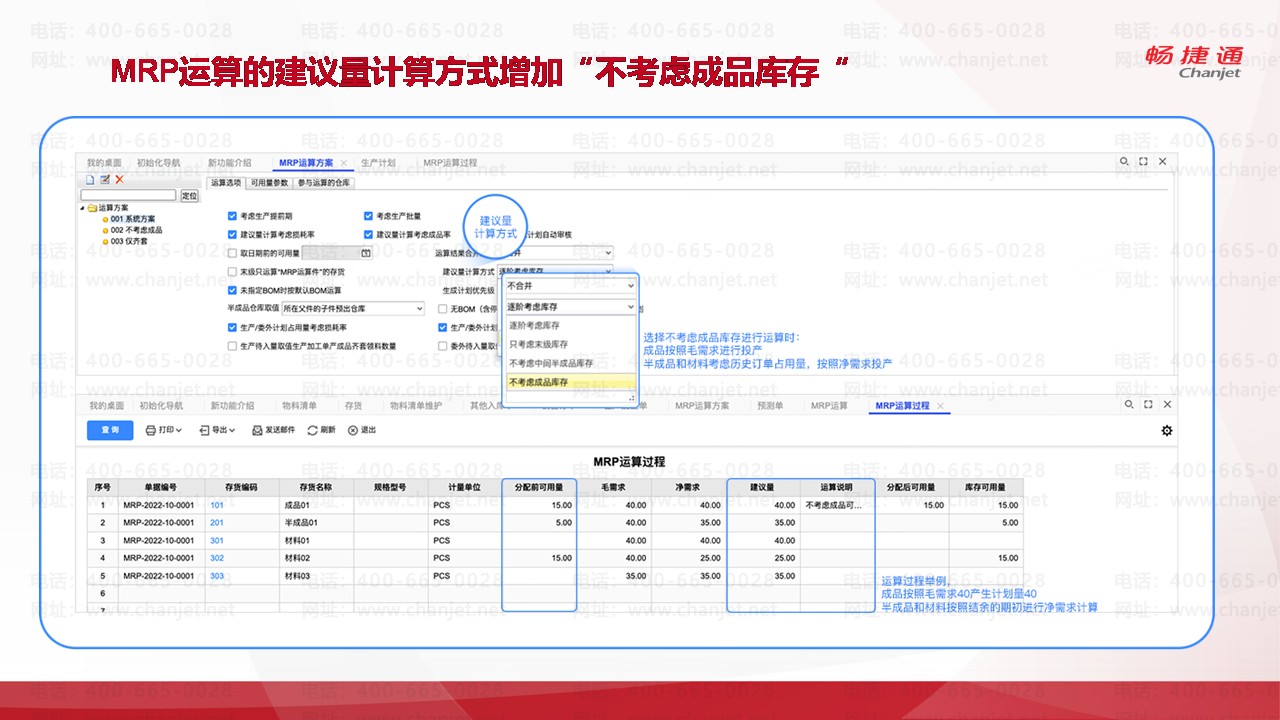 运算参数“建议量计算方式”说明:基于BOM阶级对存货进行毛需求和净需求运算,考虑库存为按照净需求运算,不考虑库存则按照毛需求运算。如:“只考虑末级库存”即成品和半成品计算毛需求,末级材料计算净需求;“不考虑中间半成品库存”即为成品和末级材料计算净需求,半成品计算毛需求。