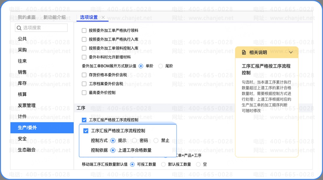 该选项为全局设置。如仅需要对部分生产加工单或部分工序进行流程严格控制,则不要勾选该选项。对于需要流程控制的生产加工单或者工序启用工序转移,可以达到相同效果。