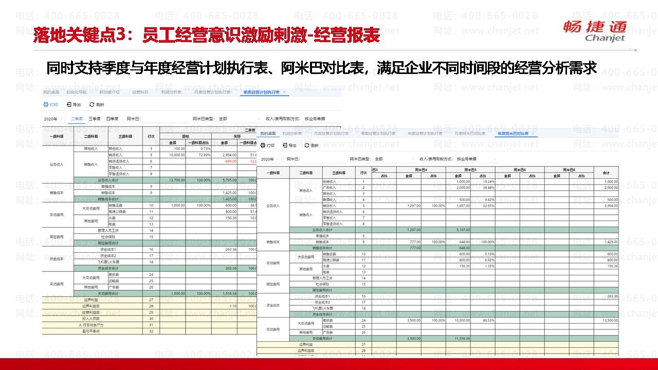 同时支持季度与年度经营计划执行表、阿米巴对比表,满足企业不同时间段的经营分析需求
