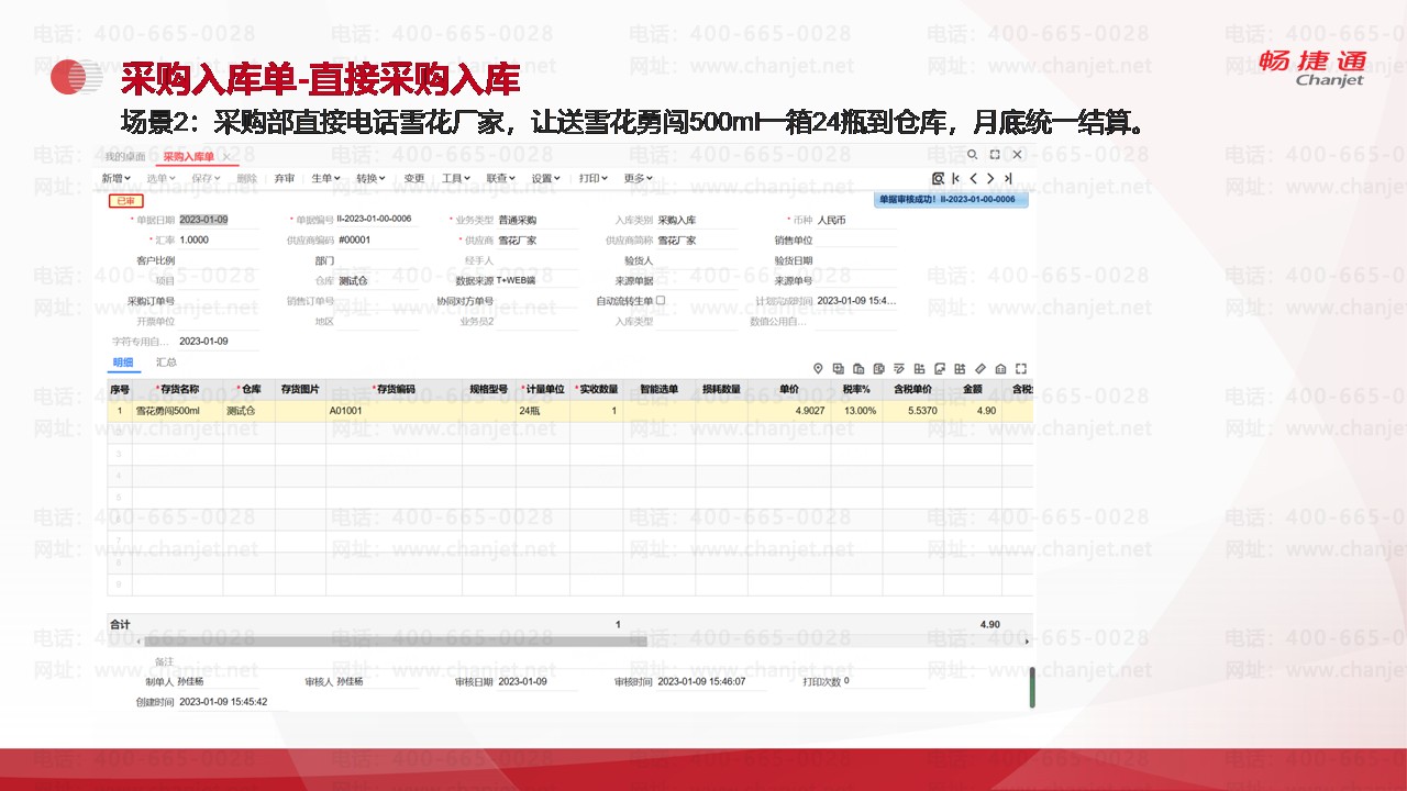 场景2:采购部直接电话雪花厂家,让送雪花勇闯500ml一箱24瓶到仓库,月底统一结算。