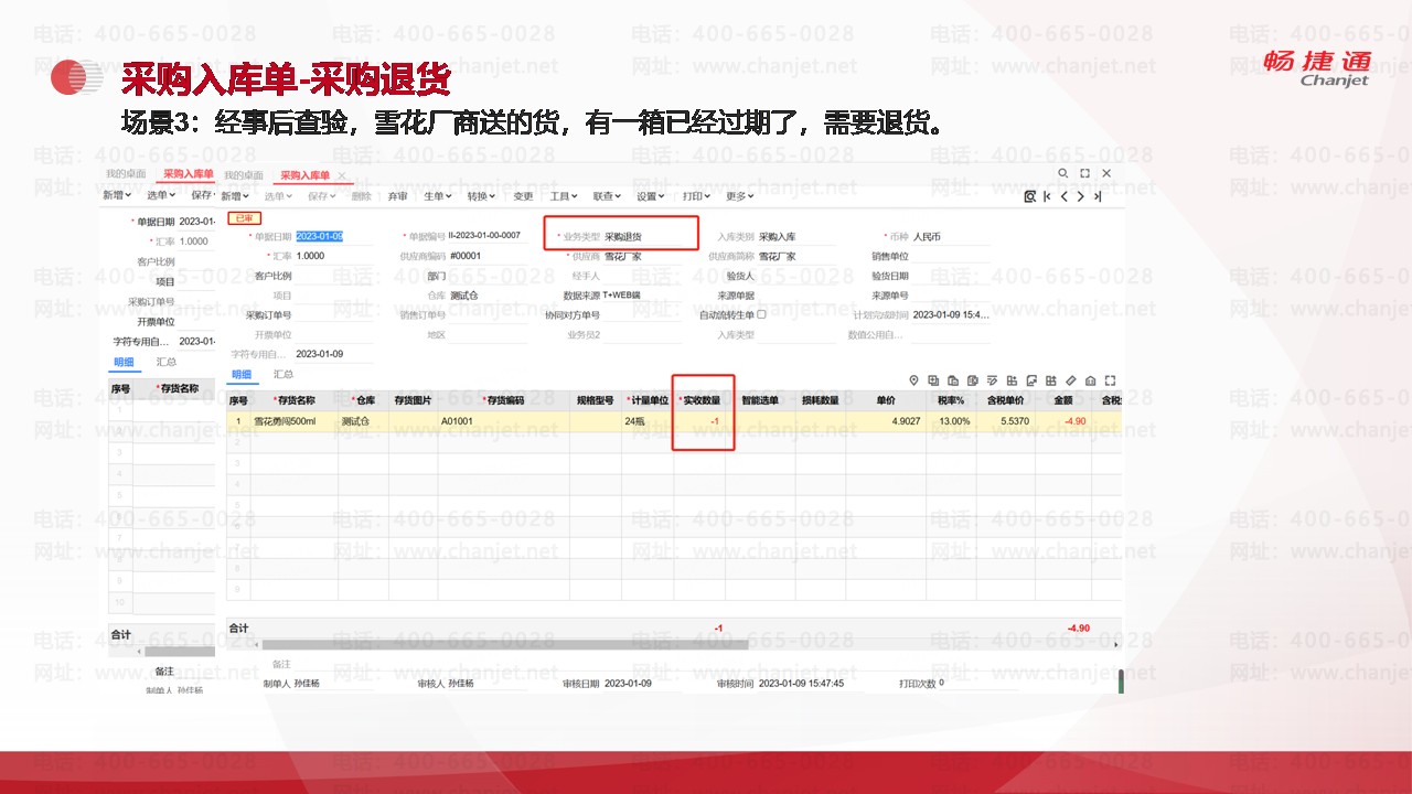 场景3:经事后查验,雪花厂商送的货,有一箱已经过期了,需要退货。