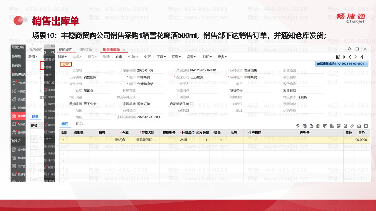 场景10:丰德商贸向公司销售采购1箱雪花啤酒500ml,销售部下达销售订单,并通知仓库发货;