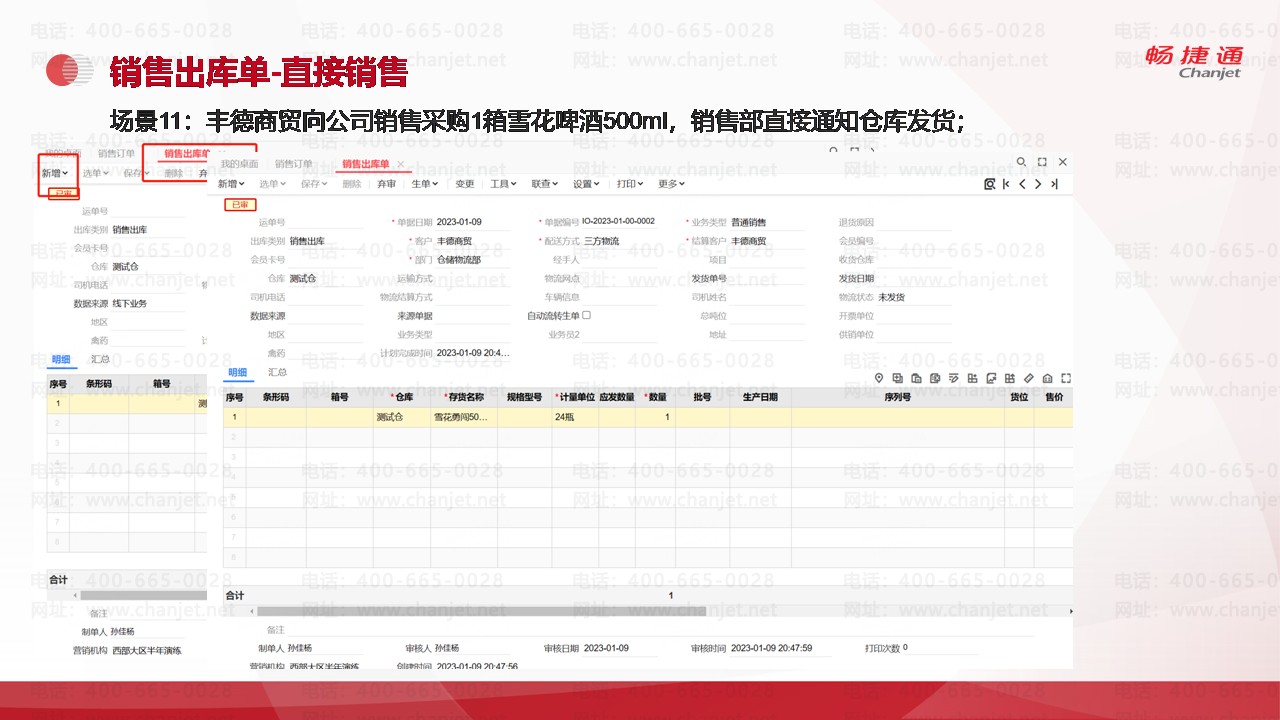 场景11:丰德商贸向公司销售采购1箱雪花啤酒500ml,销售部直接通知仓库发货;