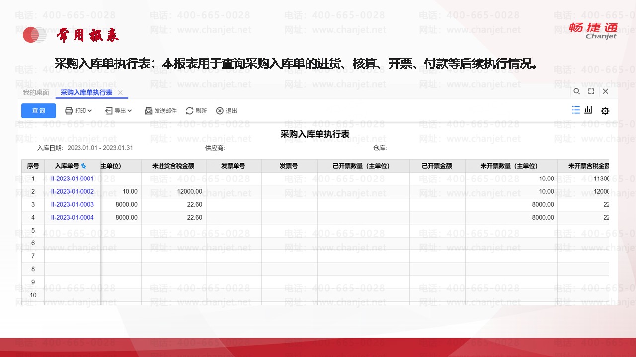 采购入库单执行表:本报表用于查询采购入库单的进货、核算、开票、付款等后续执行情况。