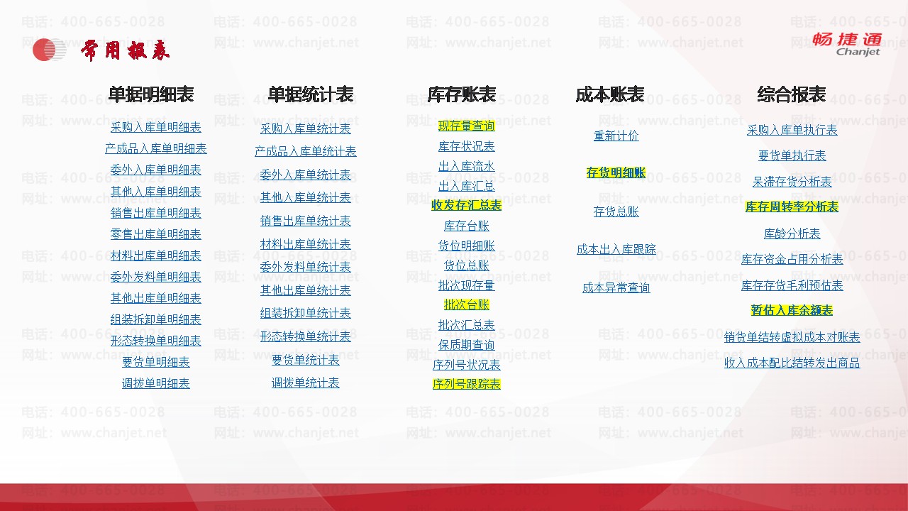 现存量查询:现存量查询是库存管理中一个常用功能。现存量查询工具用来查询当前各仓库、存货、批号、自由项时点数据,现存量查询数据中包括可用量、现存量、预计入库量、预计出库量等数据,为用户提供丰富的数据信息。