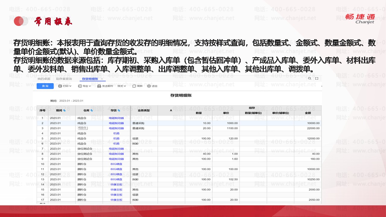 存货明细账:本报表用于查询存货的收发存的明细情况,支持按样式查询,包括数量式、金额式、数量金额式、数量单价金额式(默认)、单价数量金额式。