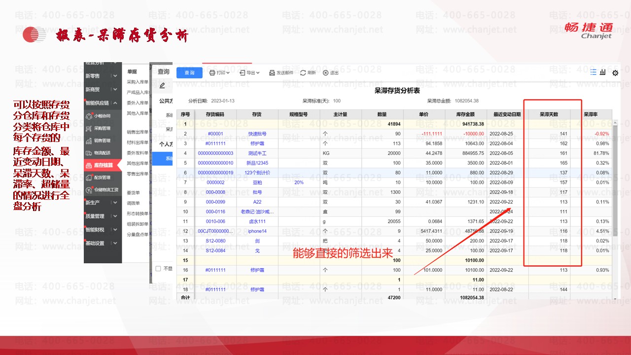 场景:我想看看企业呆滞商品100天以上的有哪些?