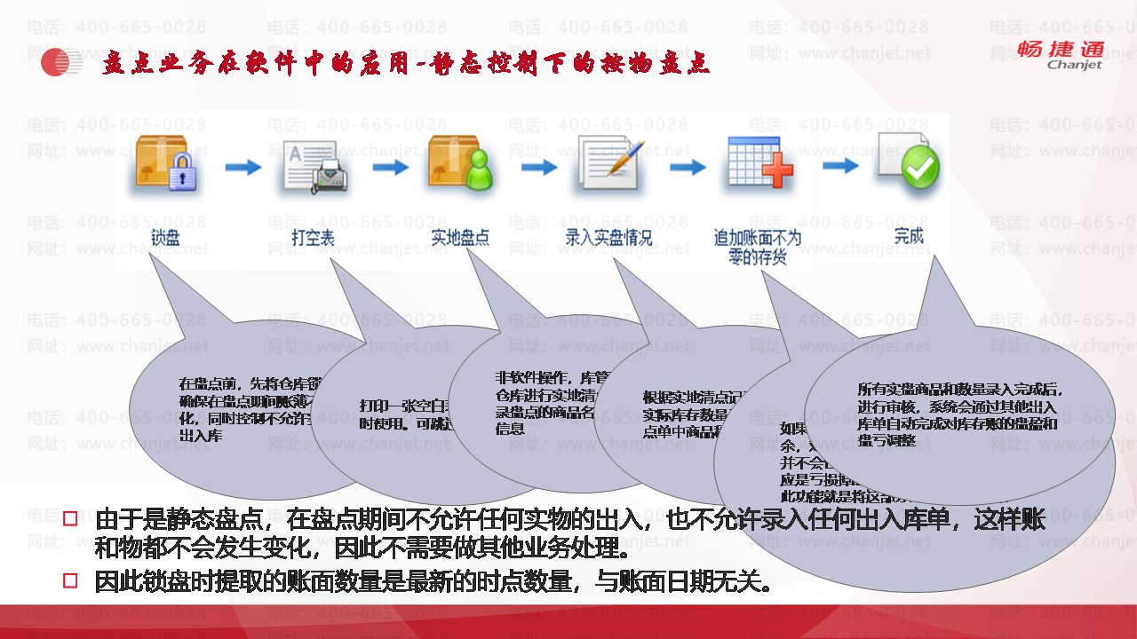 由于是静态盘点,在盘点期间不允许任何实物的出入,也不允许录入任何出入库单,这样账和物都不会发生变化,因此不需要做其他业务处理。