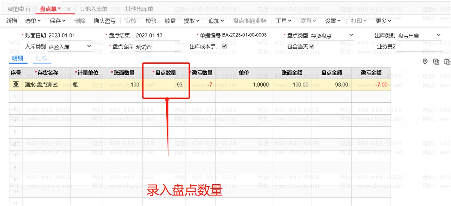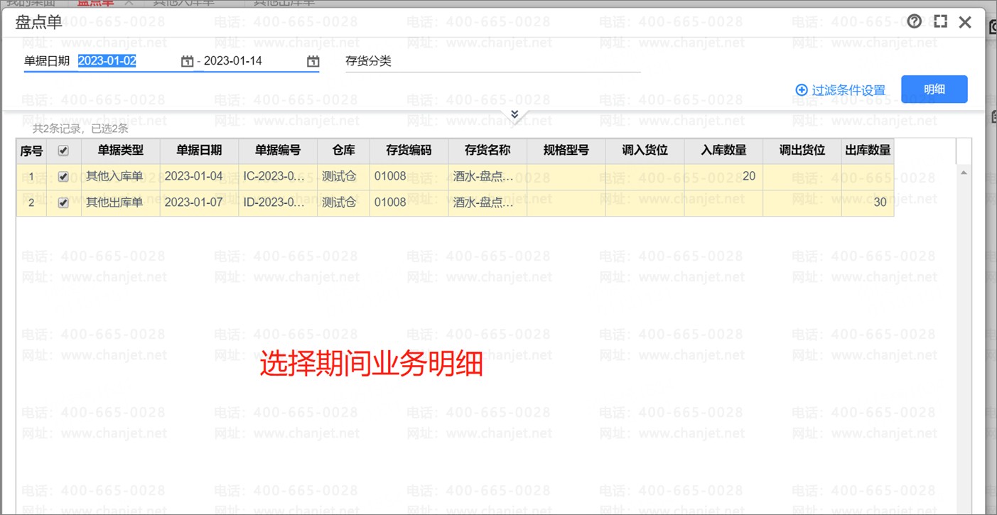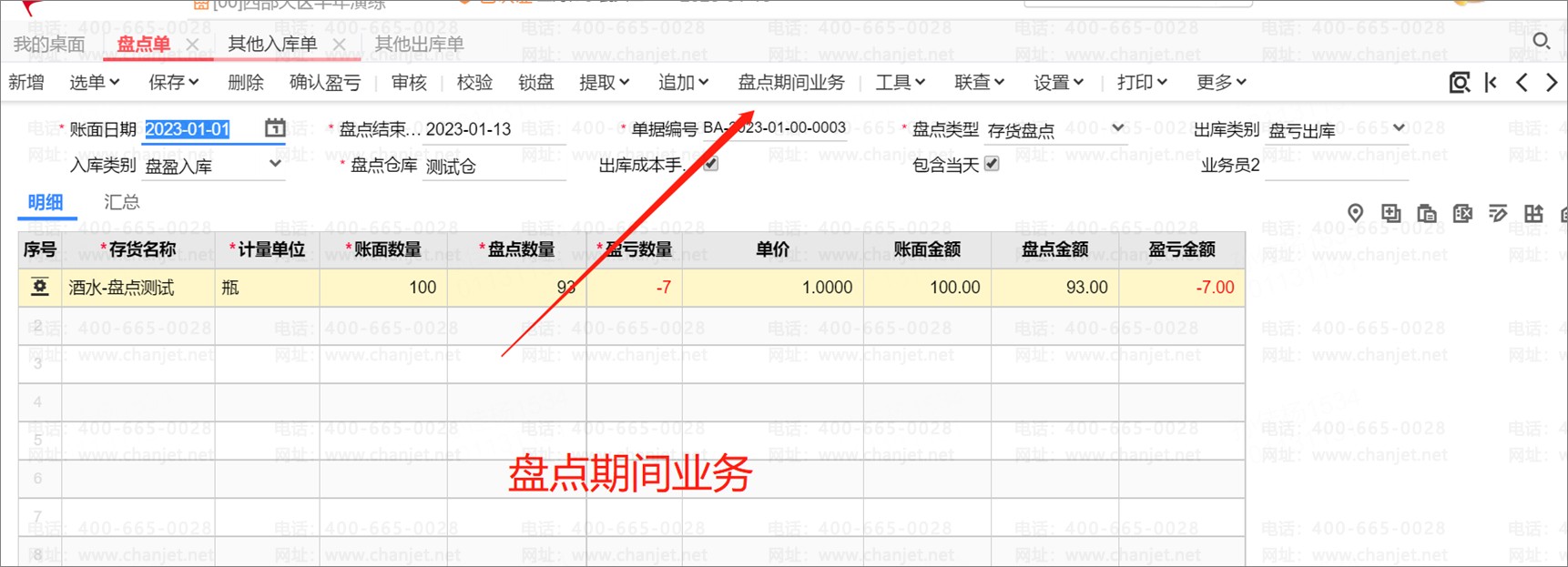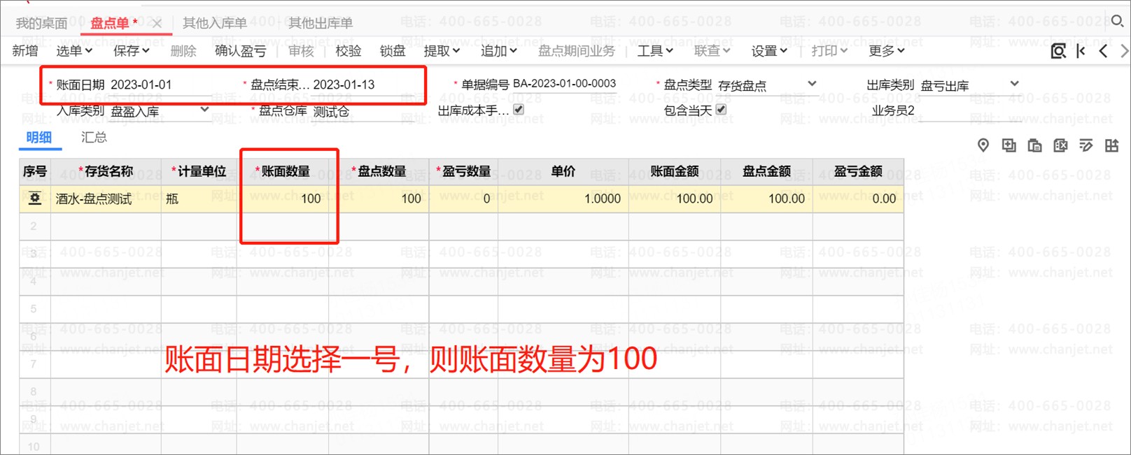 场景:假如2023.1.2日,酒水-盘点测试商品有100个,2023.1.13开始盘点作业,但在清点到此商品之前,1.4日入库了20个,1.7日又出库了30个。