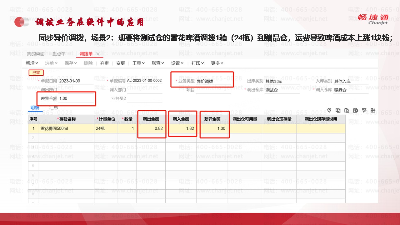 同步异价调拨,场景2:现要将测试仓的雪花啤酒调拨1箱(24瓶)到赠品仓,运费导致啤酒成本上涨1块钱;