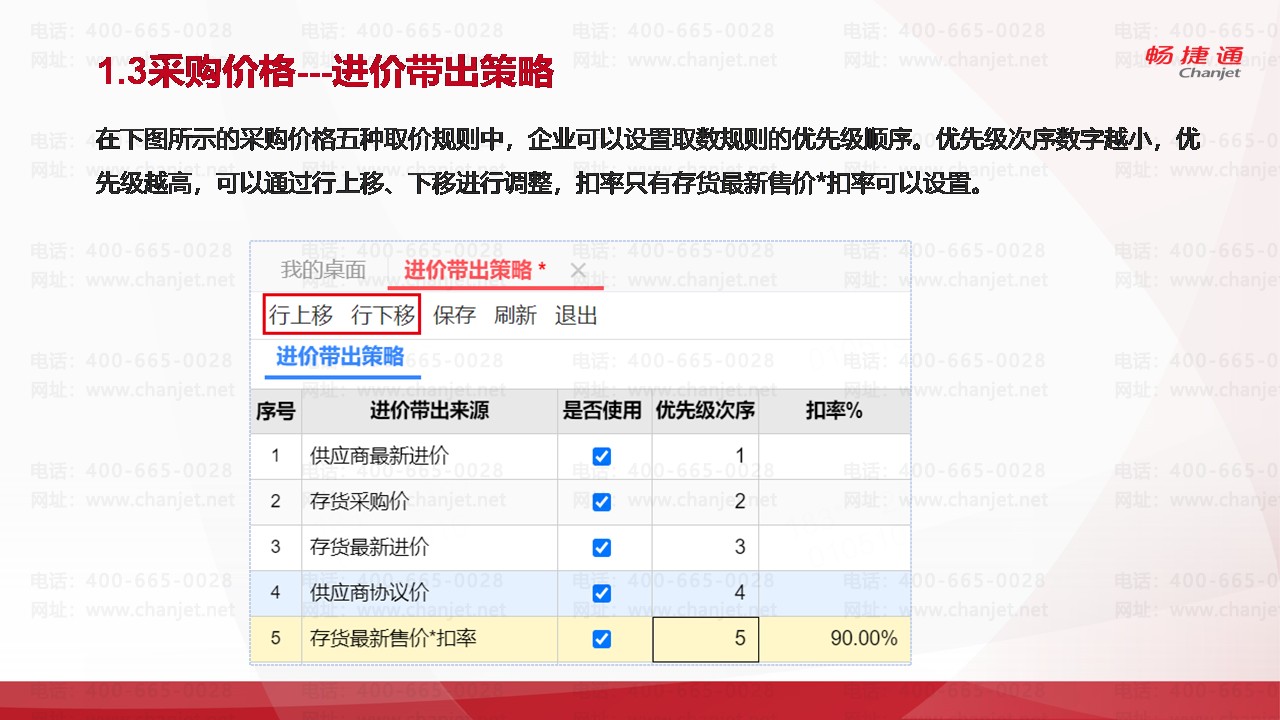 在下图所示的采购价格五种取价规则中,企业可以设置取数规则的优先级顺序。优先级次序数字越小,优先级越高,可以通过行上移、下移进行调整,扣率只有存货最新售价*扣率可以设置。