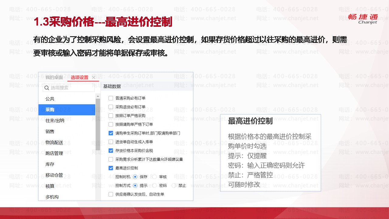有的企业为了控制采购风险,会设置最高进价控制,如果存货价格超过以往采购的最高进价,则需要审核或输入密码才能将单据保存或审核。