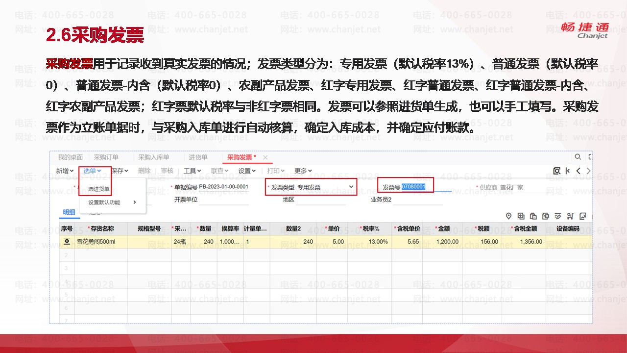 采购发票用于记录收到真实发票的情况;发票类型分为:专用发票(默认税率13%)、普通发票(默认税率0)、普通发票-内含(默认税率0)、农副产品发票、红字专用发票、红字普通发票、红字普通发票-内含、红字农副产品发票;红字票默认税率与非红字票相同。发票可以参照进货单生成,也可以手工填写。采购发票作为立账单据时,与采购入库单进行自动核算,确定入库成本,并确定应付账款。