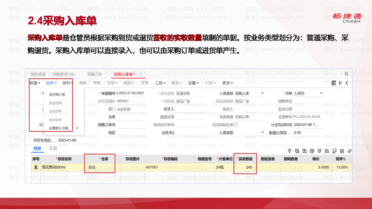 采购入库单是仓管员根据采购到货或退货签收的实收数量填制的单据。按业务类型划分为:普通采购、采购退货。采购入库单可以直接录入,也可以由采购订单或进货单产生。