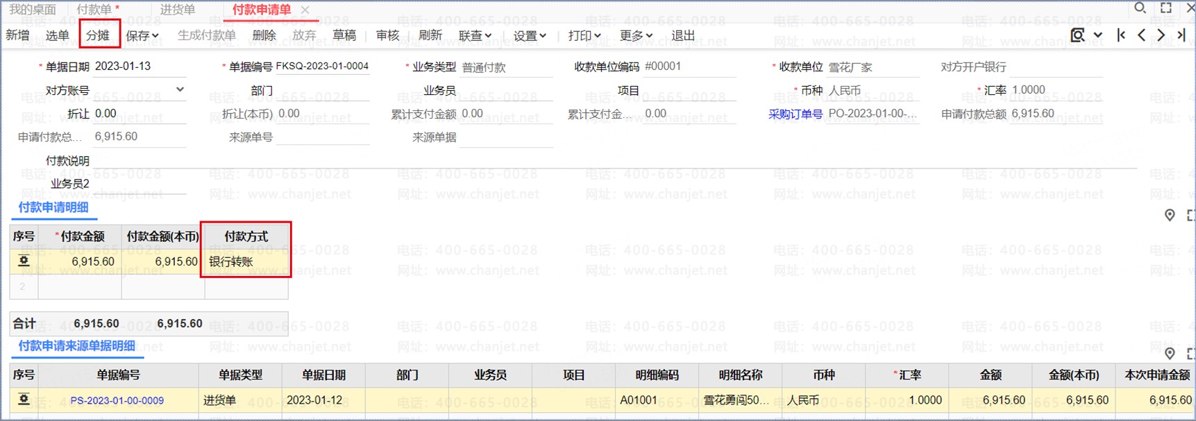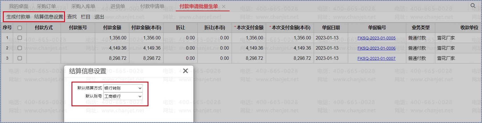 付款申请批量生单将一定时期内的付款申请单批量生成付款单。可直接在界面上通过“结算信息设置”按钮快速录入付款方式、账号,录入付款方式、账号及付款金额后,选择需要生成付款单的记录,点击批量生单按钮即可。