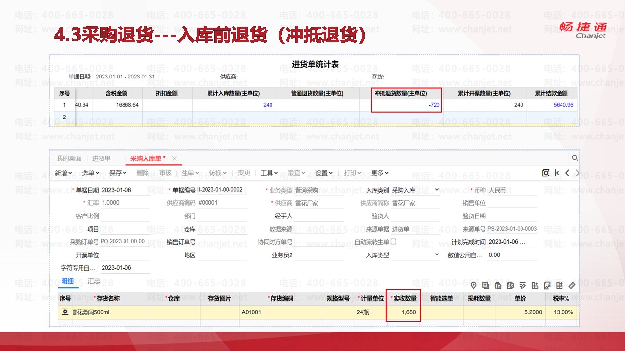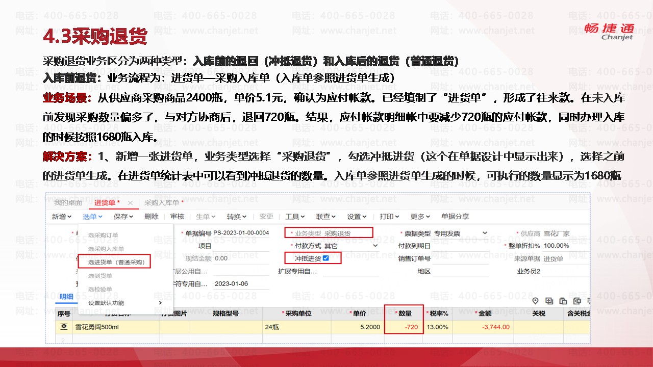 业务场景:从供应商采购商品2400瓶,单价5.1元,确认为应付帐款。已经填制了“进货单”,形成了往来款。在未入库前发现采购数量偏多了,与对方协商后,退回720瓶。结果,应付帐款明细帐中要减少720瓶的应付帐款,同时办理入库的时候按照1680瓶入库。