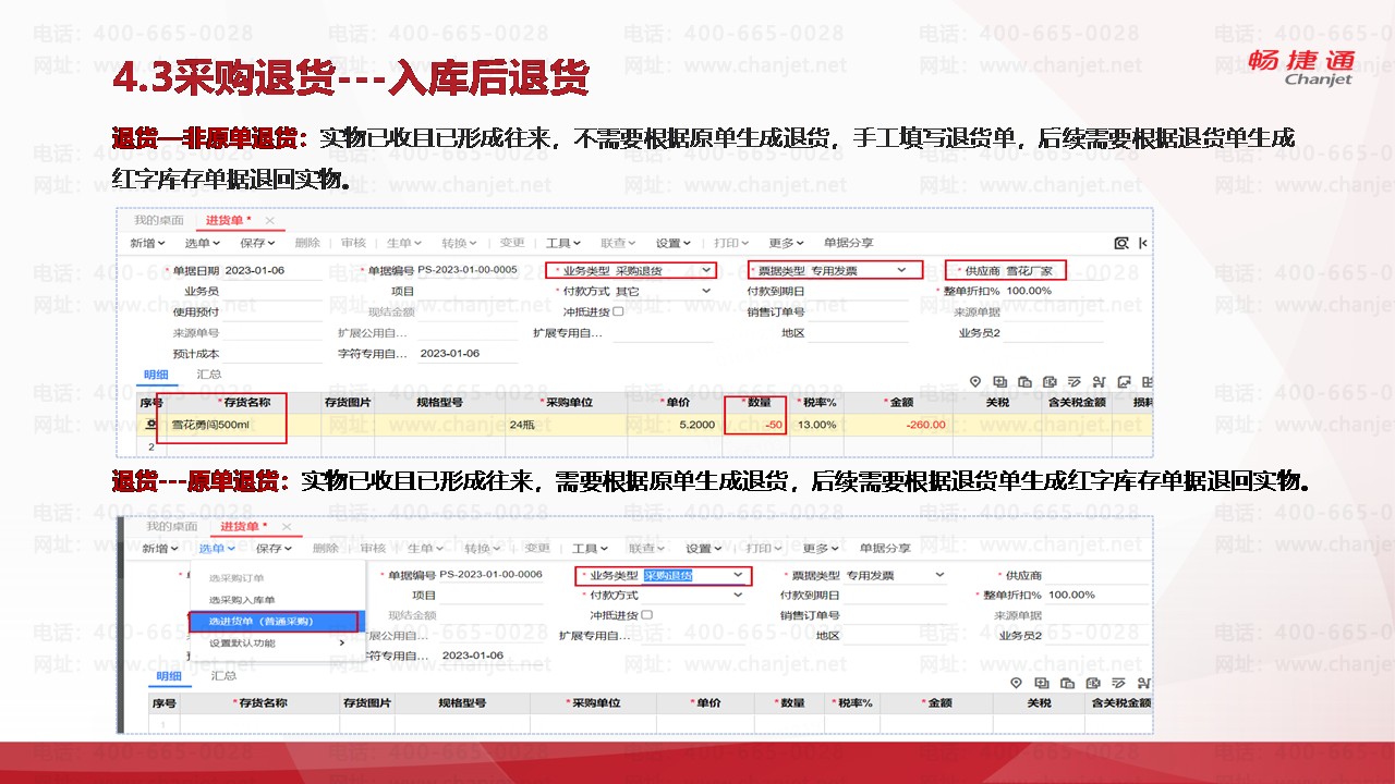 采购退货业务区分为两种类型:入库前的退回(冲抵退货)和入库后的退货(普通退货)