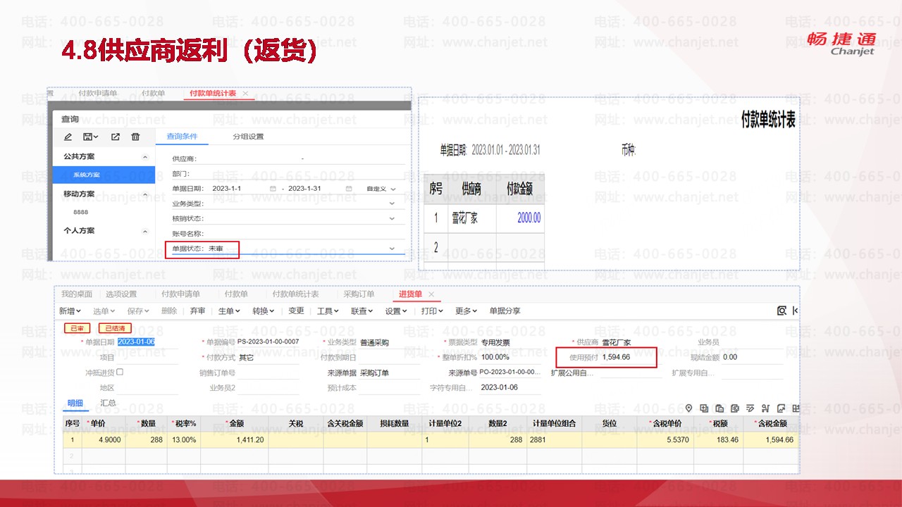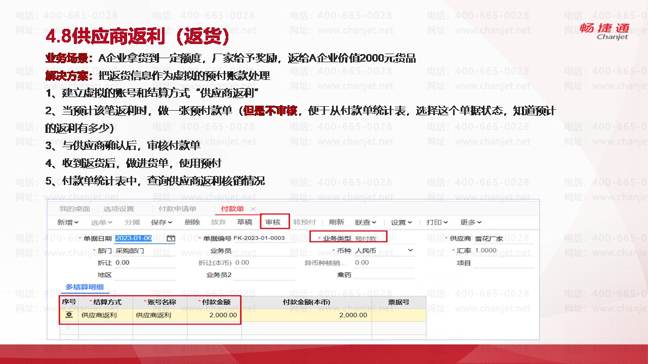 2、当预计该笔返利时,做一张预付款单(但是不审核,便于从付款单统计表,选择这个单据状态,知道预计的返利有多少)