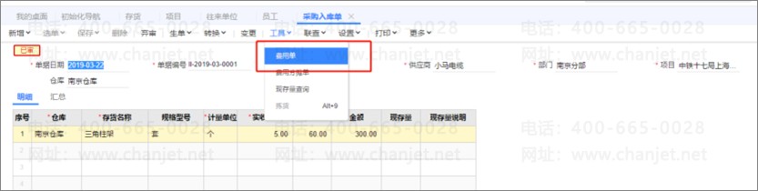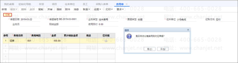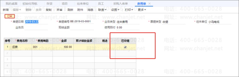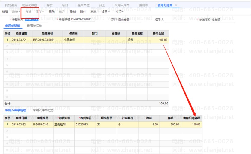 运费每笔结算的可以通过采购入库单的“工具”内的“费用单”选项直接填写对应的费用明细并进行自动分摊;若是多笔结算的则可以使用“费用分摊单”为费用选择多笔对应的“采购入库单”进行手动分摊。