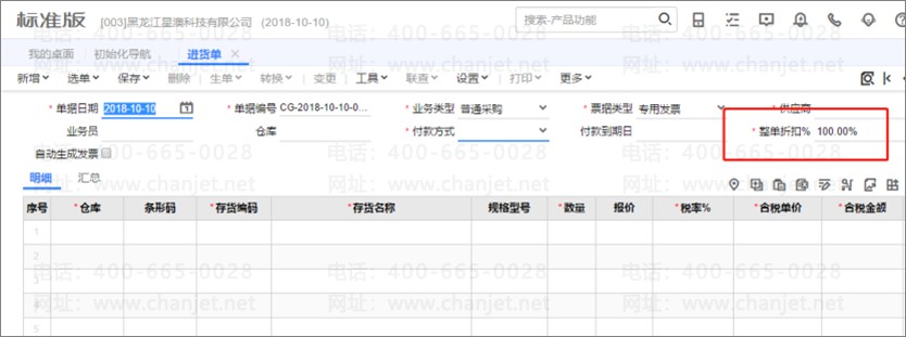 采用进货单整单折扣的方式来录入供应商赠送的商品。财务上以现金折扣科目进行对应,根据折扣业务类型可以查看返利统计报表。