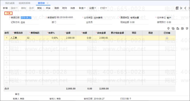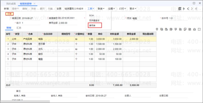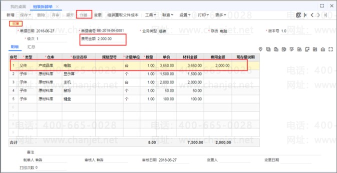 组装拆卸单—工具—费用单,填写具体费用,然后在表头上面输入费用金额,点击分摊,直接分摊到产成品成本上面。
